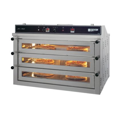 Jet Air Pizza Oven, Electric, 3 decks, each deck 40″w x 23-1/2″d x 5-1/2″, capacity (6) 18″ dia. pizzas, full view glass doors, interior lights, stainless steel interior & exterior, 240/60/1v