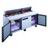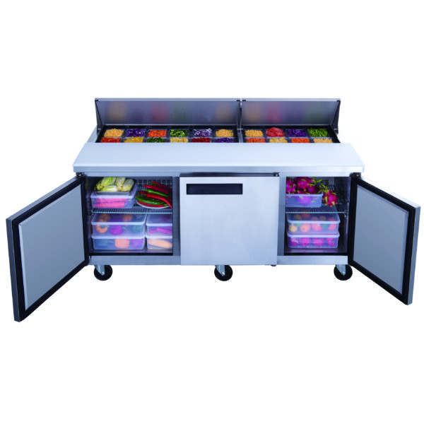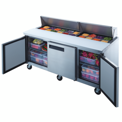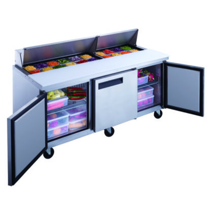 The Dukers DSP72-18-S3 commercial food prep table refrigerator is constructed of durable brushed stainless steel to handle all the challenges in the kitchen. It’s designed with ample space for food storage and preparation to perform as well as it looks. Constructed of durable brushed stainless steel to handle years of use while being easy to maintain. Includes 18 1/6 pan containers to hold a large assortment of food and toppings. Features recessed handles for clean styling. Digital controls fine-tune the desired interior temperature. Foam insulated for consistent temperatures. Self-closing doors free up your hands for added convenience and ease of use. Auto-defrosting provides lower energy costs and colder temperatures. Includes cutting board to quickly prepare food and 4 in. locking casters for mobility.