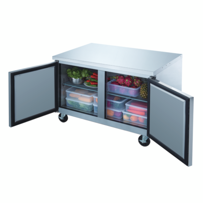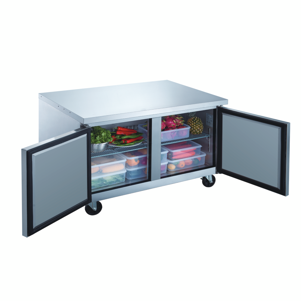 The Dukers DUC60R undercounter refrigerator has a spacious capacity and all over brushed stainless steel construction. With a temperature range of 33 to 41°F, it chills and safely stores all type of food. Digital temperature controls and LED display lets you precisely pick the desired temperature. Designed with a bottom mounted 1/5 HP compressor for efficiency. Includes 2 adjustable and removable wire shelves.