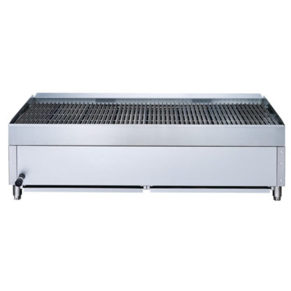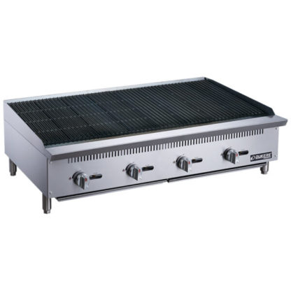 The Dukers DCCB48 48 in. W Countertop Charbroiler features 30,000 BTUs, independent manual controls, a full width crumb tray and adjustable stainless steel legs.