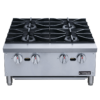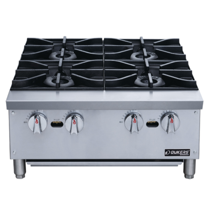 The Dukers DCHPA24 hot plate with 4 burners features 28,000 BTUs and works with natural gas or liquid propane.