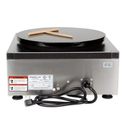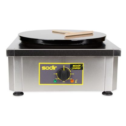 Sodir-Roller Grill Crepe Machine, single, 13-3/4″ dia. enamel coated cast iron plate, batter spreader, thermostatically controlled up to 570°F, stainless steel construction, 208/240v/60/1-ph, 12.0/14.0 amps, 3.3kW, NEMA 6-20P, cUlus, cULus Classified