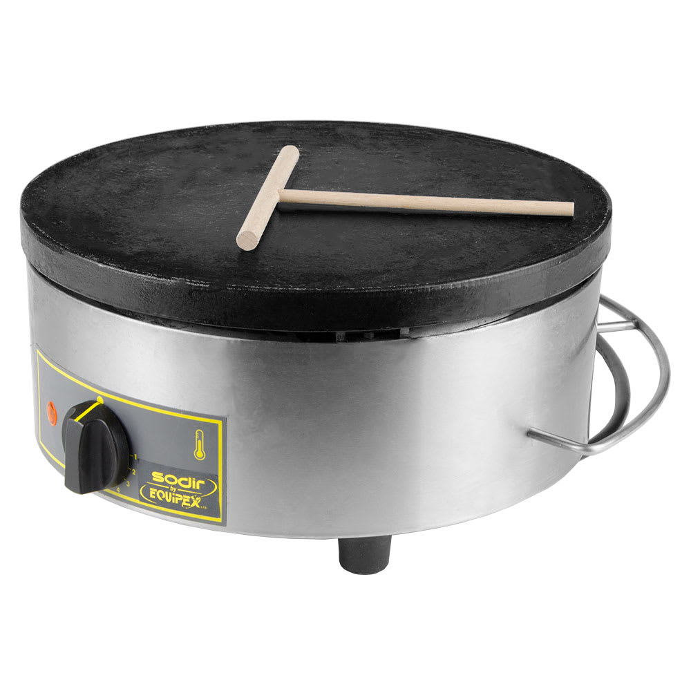 Sodir Crepe Machine, single, 13-3/4″ dia. enamel coated cast iron plate, batter spreader, thermostatically controlled up to 570°F, stainless steel construction, 120v/60/1-ph, 14.0 amps, 1.65 kW, NEMA 5-15P, cULus
