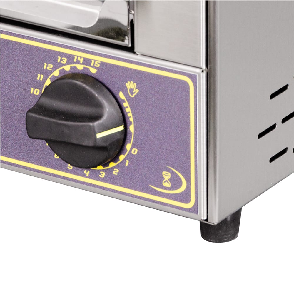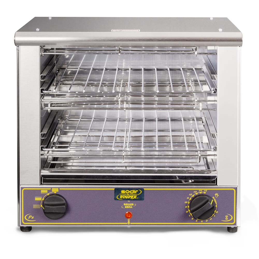 Sodir-Roller Grill Toaster Oven, double shelf, open-style, 18″L, 11-1/2″D, 17″H, top & bottom infrared heat, 15 min. timer, (2) wire racks, crumb tray, heat-resistant removable rack handles, stainless steel construction, 120v/60/1-ph, 14.0 amps, 1.7kW, NEMA 5-15P, UL