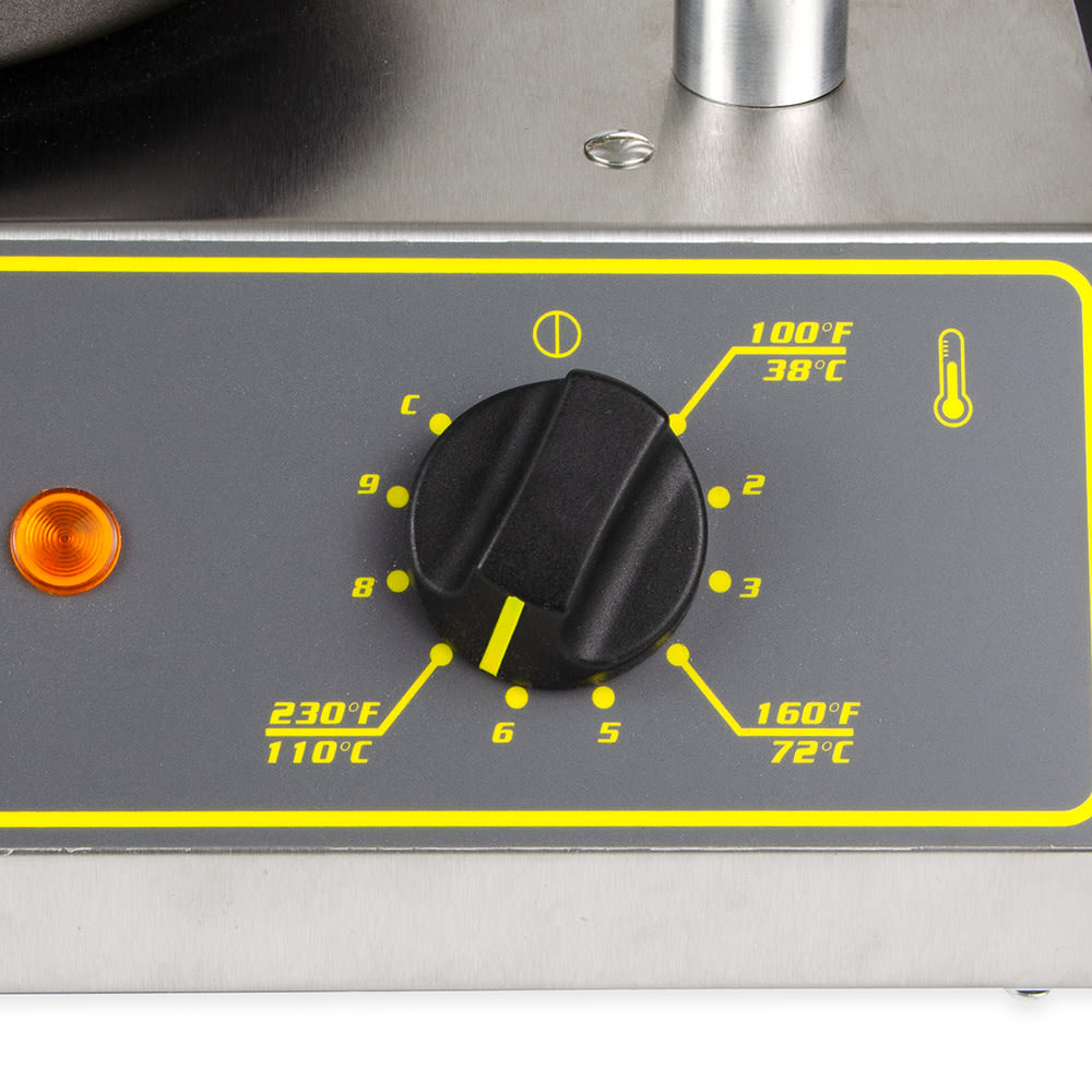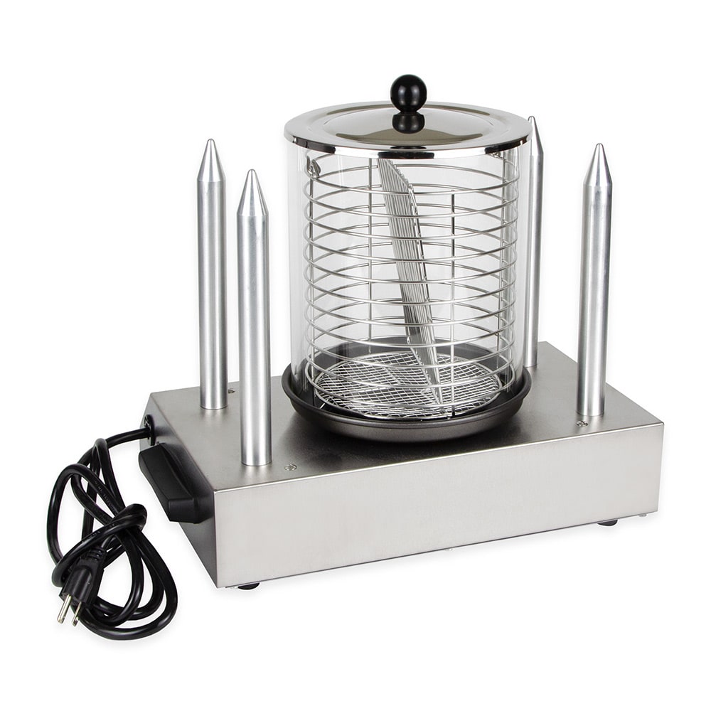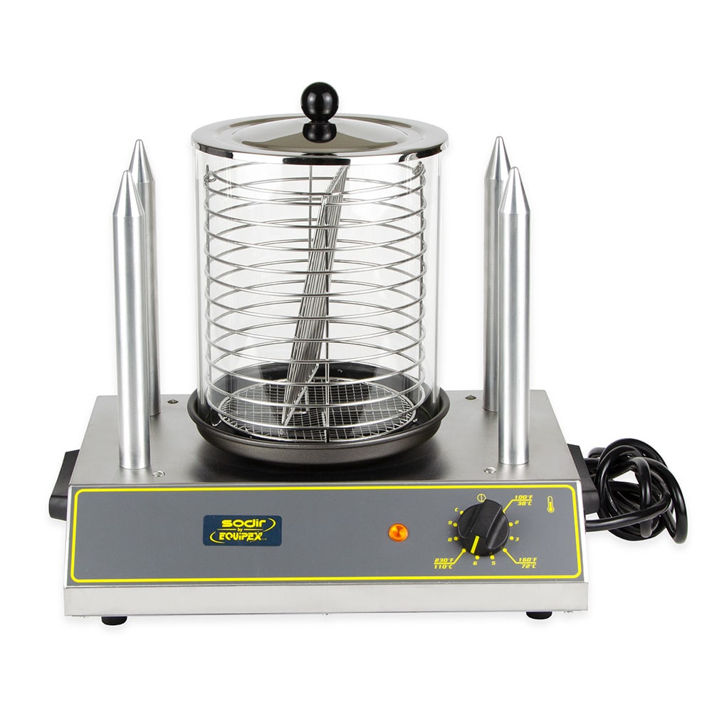 The Equipex CS4E Sodir-Roller Grill hot dog steamer has the capacity to hold as many as 40 hot dogs. A Pyrex glass steamer holds and cooks the hot dogs, while the four toasting spikes hold and toast the buns, enabling the user to prepare hot dogs and buns at the same time. Steam is created as the stainless steel water pan is warmed up by a thermostatically controlled heating element. This unit has a European design, which creates a unique look.