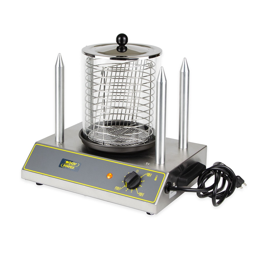Sodir-Roller Grill Hot Dog Machine, European-style, pyrex glass steamer, (40) dog capacity, (4) toasting spikes for torpedo rolls, thermostatically controlled, 120v/60/1-ph, 6.0 amps, .65kW, NEMA 5-15P, cULus, cULus Classified