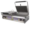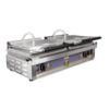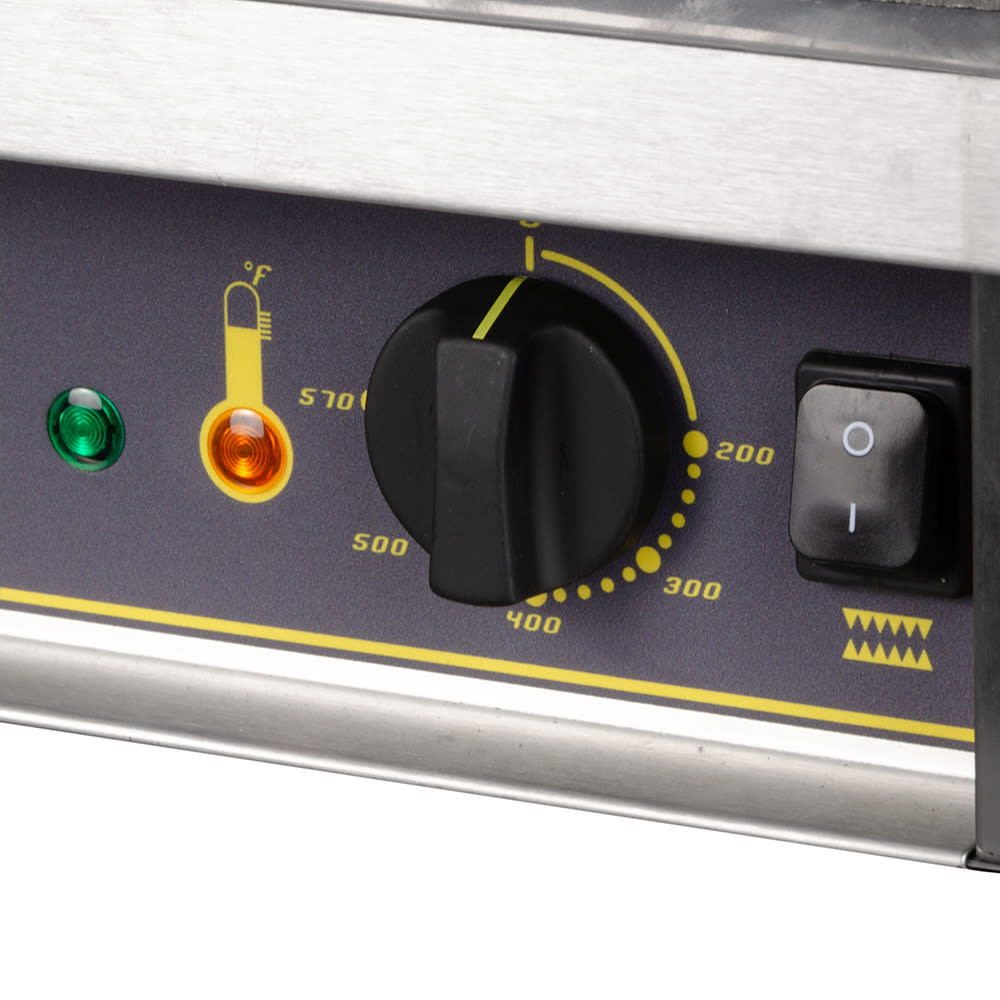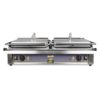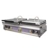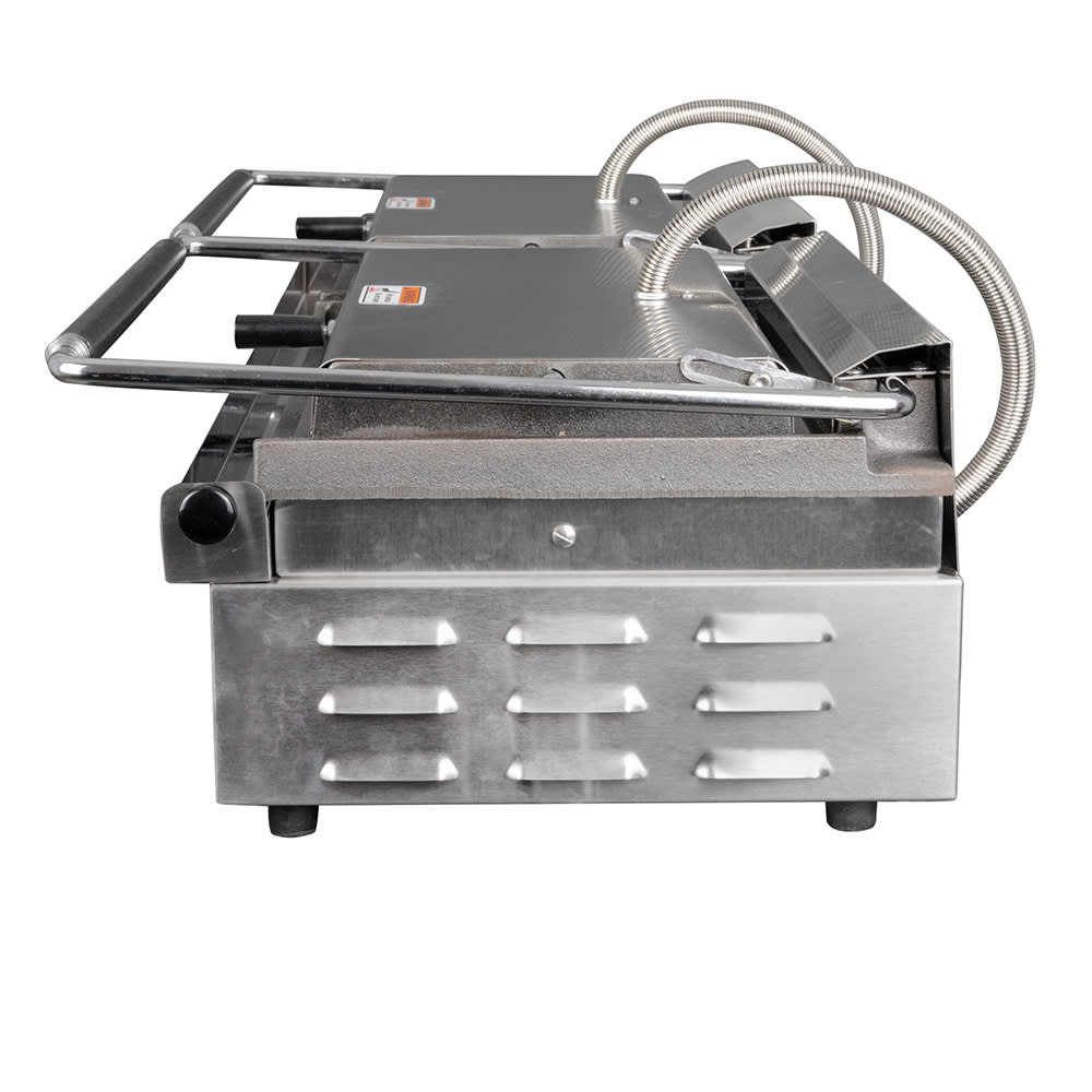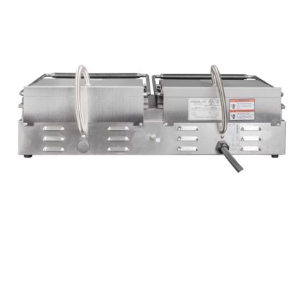 Perfect for grilling sandwiches, meat, fish, and vegetables, the Equipex DIABLO double panini press has a large cooking surface with two areas. The cooking surface is made up of bottom plates with two top plates that can be lowered onto the food. These plates are all constructed of cast iron, so they are heavier than aluminum and more durable, providing better heat retention and distribution but slower heat-up times. Because the top and bottom plates are ribbed, they leave grill marks on the food to enhance product presentation. The unit’s housing is made of stainless steel for rust resistance and simple cleaning.