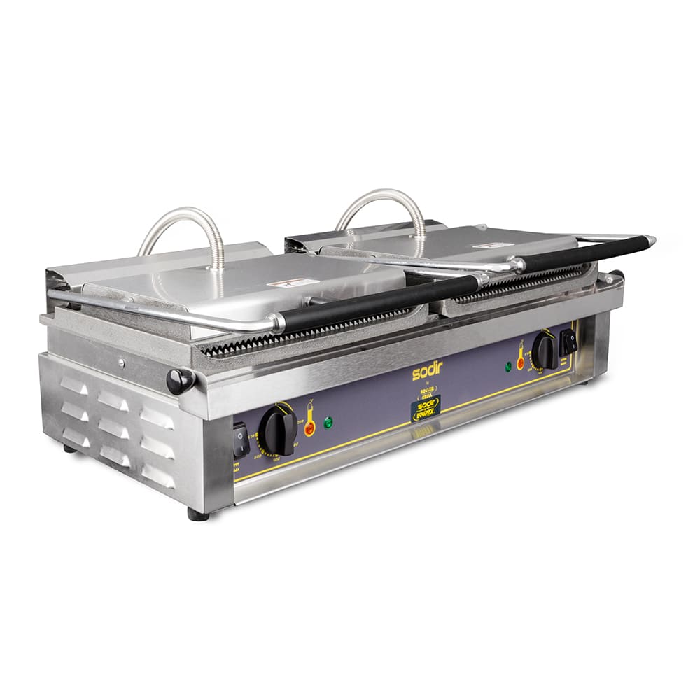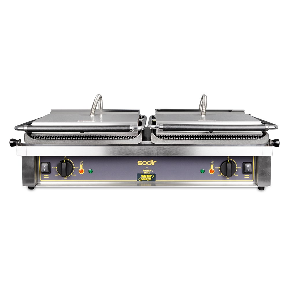 Sodir-Roller Grill Panini Grill, cast iron grooved top & grooved bottom griddle plates, (2) 14″W x 9-1/2″D grill areas, (2) independent adjustable spring counterbalanced tops, front drip tray & scraper, grills with stainless steel construction, 570°F thermostatic controls, 208/240v/60/1-ph, 24.0/27.0 amps, 6.5kW, NEMA 6-50P, cULus, cULus Classified