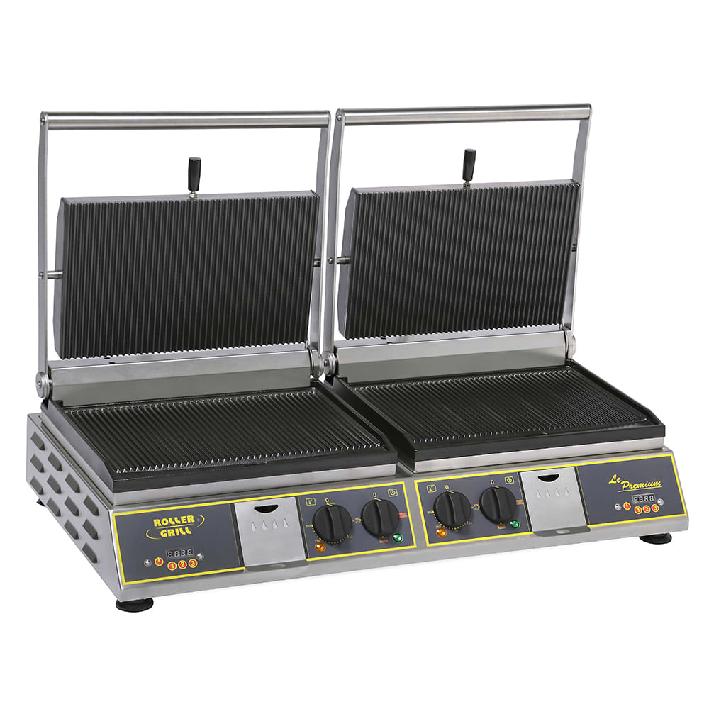 Sodir-Roller Grill Panini Grill, cast iron grooved & smooth griddle plates, (2) 14″W x 9-1/2″D grill areas, (2) self- balancing adjustable top plates with heavy duty handles, front grease drawers & selector switches for panini press or bottom plate only operation, electronic timer, grills with stainless steel construction, 570°F thermostatic controls, 208/240v/60/1-ph, 24.0/27.0 amps, 6.5kW, NEMA 6-50P, cULus, cULus Classified