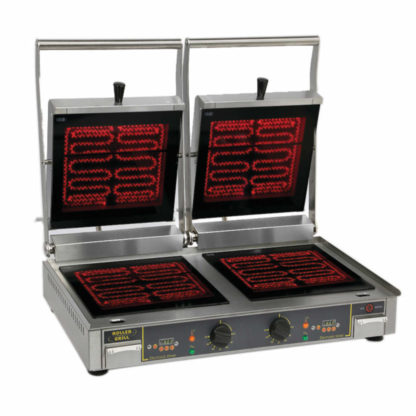 Sodir-Roller Grill Speed Panini Grill, heavy duty vitroceramic grooved top & smooth bottom griddle plates, (2) 13-1/4″W x 12″D grill areas, (3) position timer, counterbalanced top, front drip tray, stainless steel construction, 570°F thermostatic controls, 208/240v/60/1-ph, 22.0/25.0 amps, 6.0kW, NEMA 6-50P, cULus, cULus Classified