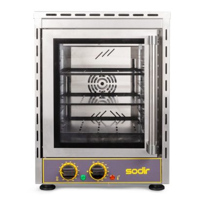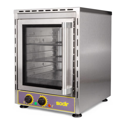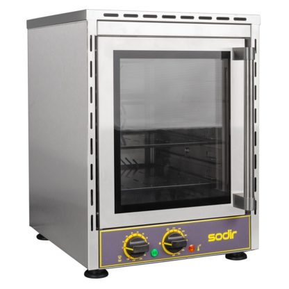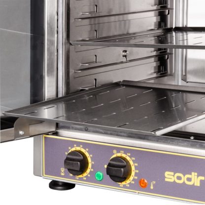 Sodir-Roller Grill Convection Oven, electric, countertop, single-deck, 450°F thermostatic controls with 120 min. timer, rear fan, (5) shelf positions, (3) slotted shelves, (1) drip pan, safety double glass door with handle, stainless steel construction, 120v/60/1-ph, 15.0 amps, 1.7kW, NEMA 5-15P, cULus, cULus Classified, NSF 4
