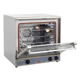 With a 450-degree Fahrenheit thermostat and 120-minute timer, the Equipex FC-33 half-size countertop convection oven has a rear fan and heater assembly, providing a true convection pattern and unique air flow design for quick and uniform baking. Made of stainless steel, the insulated oven features a glass door and handle for monitoring cooking progress. Three wire racks, one bake tray, a drip pan, and two quartz heating elements overhead are included with the unit.
