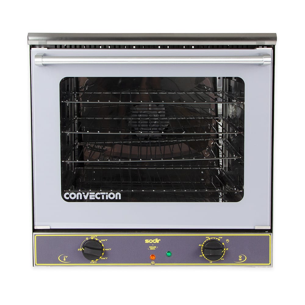 Sodir Ariel Convection Oven, electric, 1/2 size, single-deck, 570°F thermostatic controls with 120 min. timer, rear fan, (4) 13″x18″ wire shelves, stainless steel construction, double glass door, internal light, 208/240v/60/1-ph, 13.0/15.0 amps, 3.3 kW, NEMA 6-20P, UL