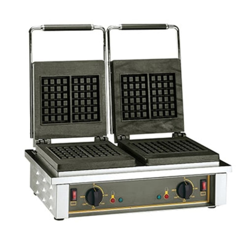 Sodir-Roller Grill Waffle Baker, electric, double, cast iron plates, “Brussels” plate pattern, heavy duty top plate, each heating zone thermostatically controlled up to 570°F, stainless steel construction, wraparound removable stainless steel drip tray, 208-240v/60/1-ph, 12.0/16.0 amps, 3.3 kW, NEMA 6-20P, UL