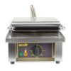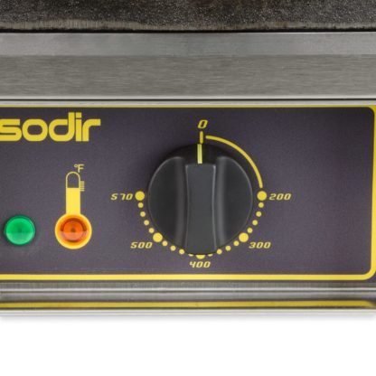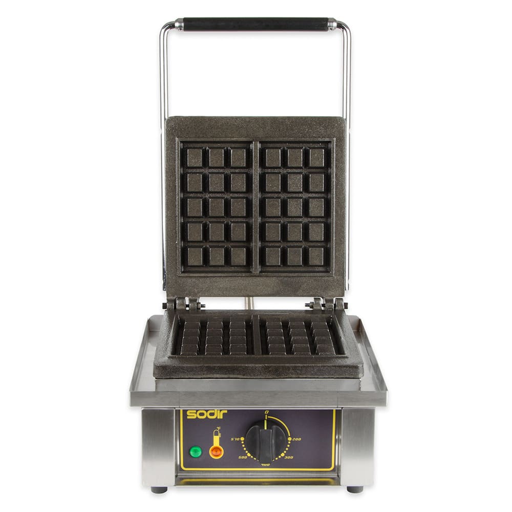 Sodir Waffle Baker, electric, single, cast iron plates, “Brussels” plate pattern, heavy duty top plate, heating zone thermostatically controlled up to 570°F, stainless steel construction, wraparound removable stainless steel drip tray, 220v/60/1-ph, 7.0/8.0 amps, 1.6 kW, NEMA 6-15P, UL