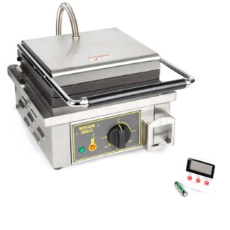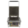 The Equipex GES80 waffle maker features heavy-duty cast iron plates, which are more durable than cast aluminum and after seasoning, they are also nonstick. A Brussels pattern on the plates presses large pockets into the waffles to catch and distribute butter and syrup. In case the waffle expands too much, the pattern has a thick rim to contain batter, and a removable tray surrounding the bottom plate catches drips.