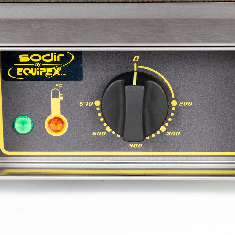 Sodir-Roller Grill Waffle Baker, electric, single, cast iron plates, “Liege” plate pattern, heavy duty top plate, heating zone thermostatically controlled up to 570°F, stainless steel construction, wraparound removable stainless steel drip tray, 208-240v/60/1-ph, 7.0/8.0 amps, 1.6 kW, NEMA 6-15P, UL