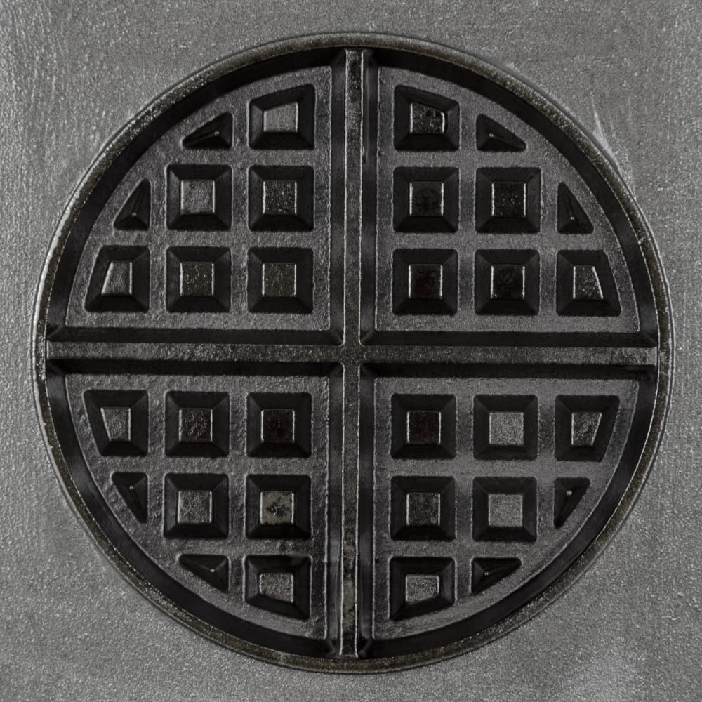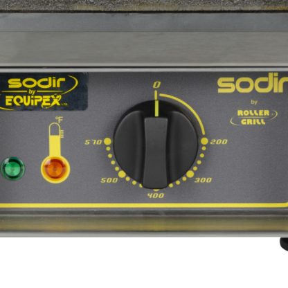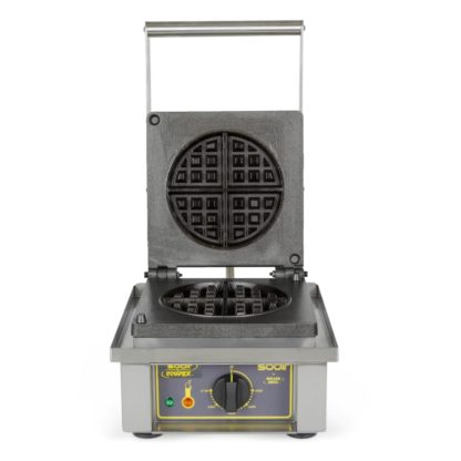 Sodir-Roller Grill Waffle Baker, electric, single, cast iron plates, “Round” plate pattern, heavy duty top plate, 7″ diameter x 1-1/4″ waffle size, heating zone thermostatically controlled up to 570°F, stainless steel construction, wraparound removable stainless steel drip tray, 120v/60/1-ph, 14.0 amps, 1.75 kW, NEMA 5-15P, UL