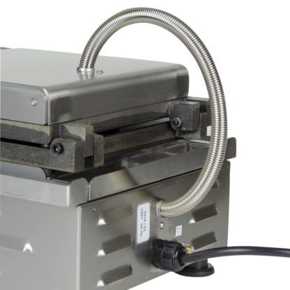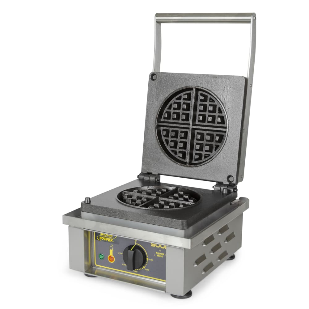 The Equipex GES75/1 waffle baker is ideal for use in breakfast establishments or school cafeterias. Its 7-inch plates are round, and their wide rims seal batter in while limiting the amount that can overflow. To support a long service life and quick cleanup, the base and wraparound drip tray are made of stainless steel.
