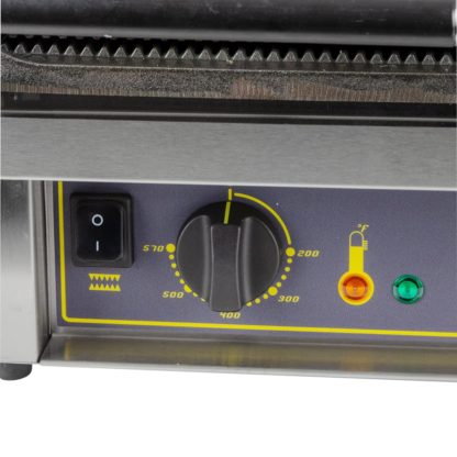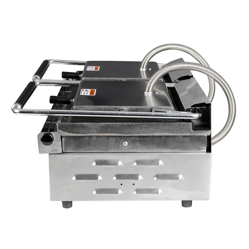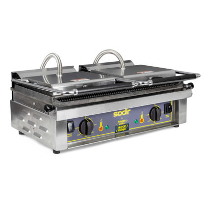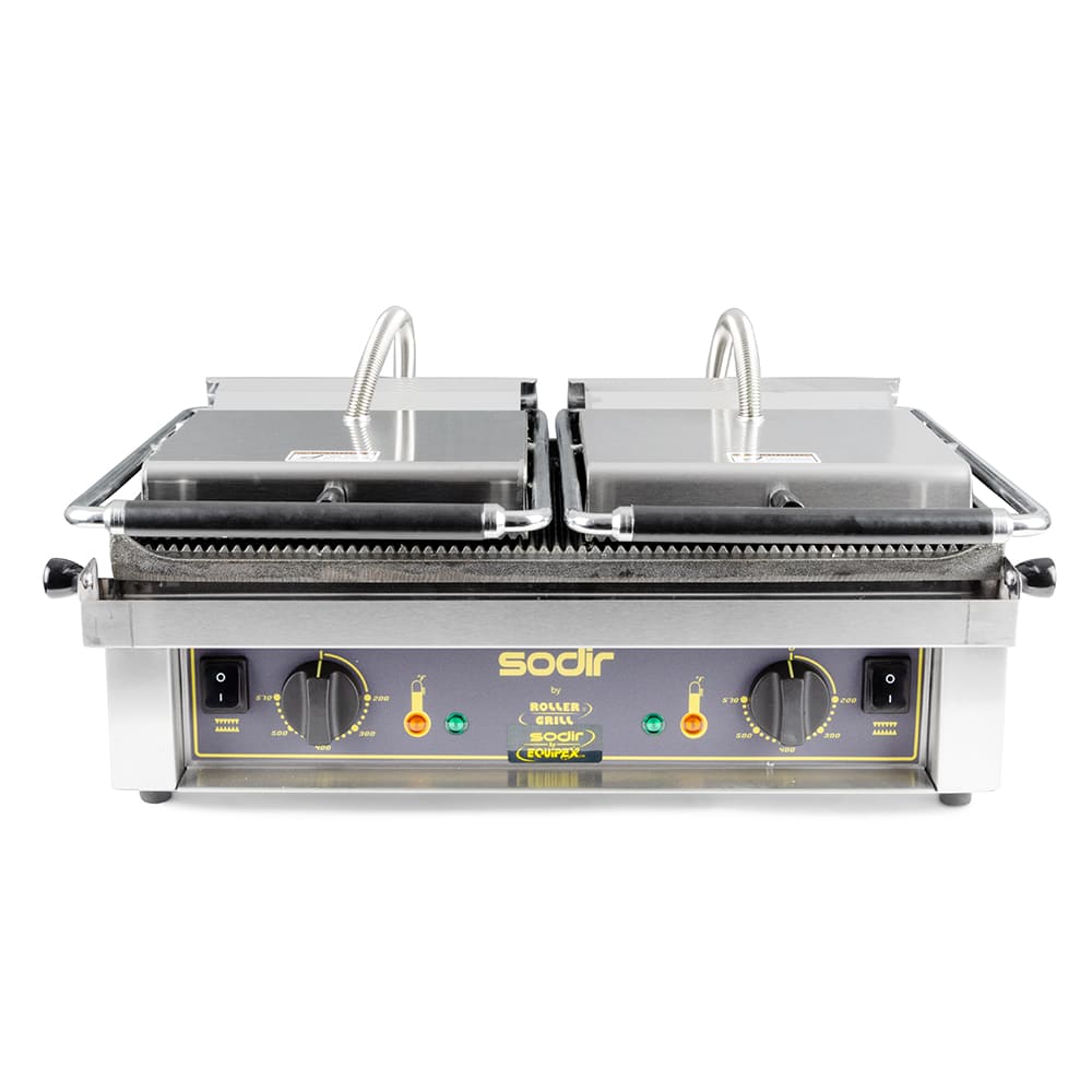 Sodir-Roller Grill Panini Grill, cast iron grooved top & grooved bottom griddle plates, 21″W x 9-1/2″D grill area, (2) independent adjustable spring counterbalanced tops, front drip tray & scraper, grills with stainless steel construction, 570°F thermostatic controls, 208/240v/60/1-ph, 16.0/18.0 amps, 4.0kW, NEMA L6-30P, cULus, cULus Classified