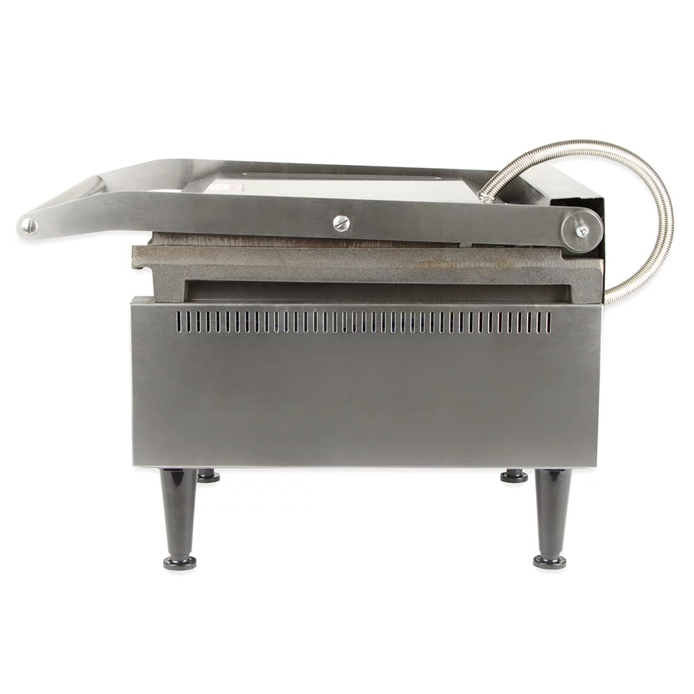 Great for grilling meats and vegetables or toasting sandwiches, the Equipex PANINI XL/1 panini press has a grooved top plate and a smooth bottom plate. The top plate leaves grill marks on food, while the bottom plate acts as a griddle surface and streamlines cleaning. As the top plate is lowered onto the food, it balances to provide even heat contact with the entire product. Users can set the unit to operate with heat on the top and bottom, just the top, or just the bottom, and the temperature is adjustable as high as 570 degrees Fahrenheit.