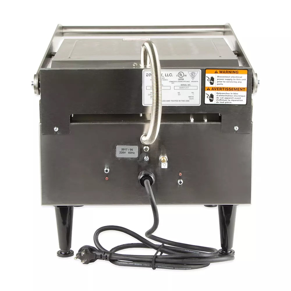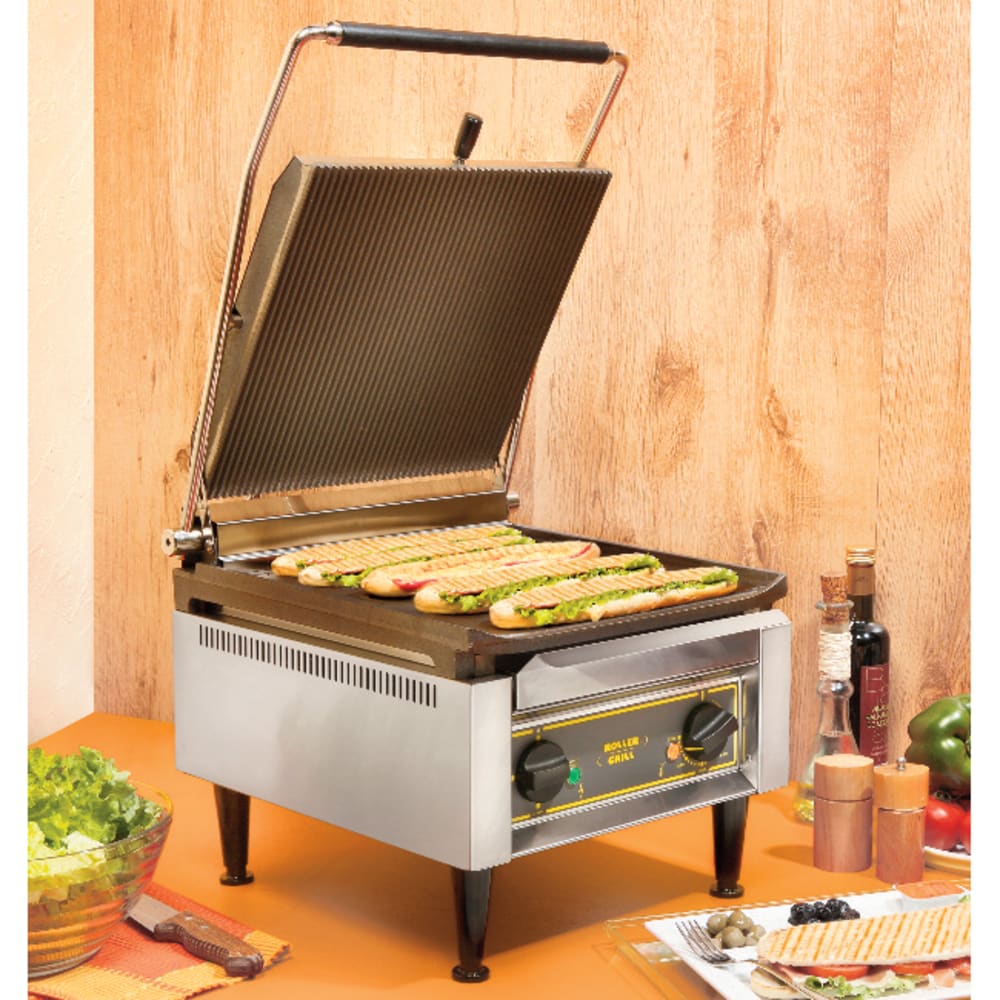 Sodir-Roller Grill Panini Grill, cast iron grooved & smooth griddle plates, 14″W x 14″D grill area, adjustable spring counterbalanced top, front drip tray & scraper, grills with stainless steel construction, 570°F thermostatic controls for top & bottom, 120v/60/1-ph, 15.0 amps, 1.75kW, NEMA 5-15P, cULus, cULus Classified