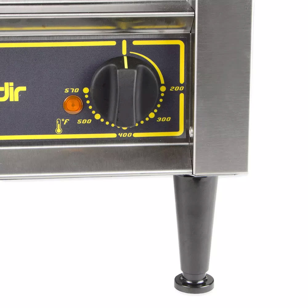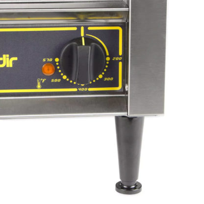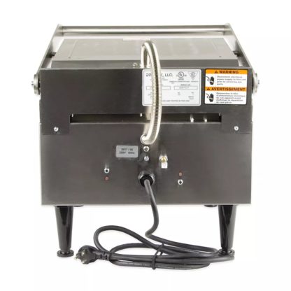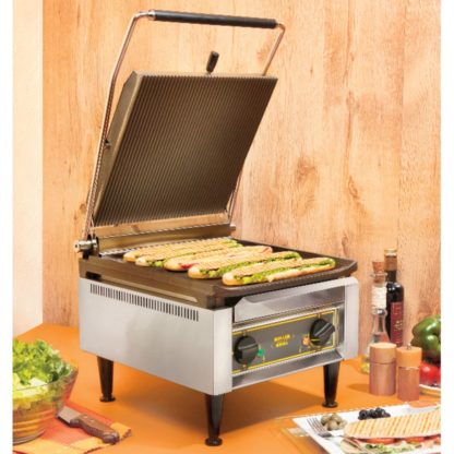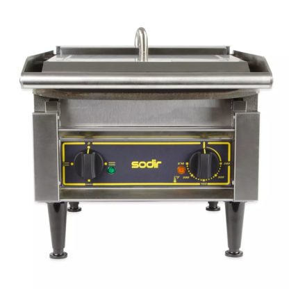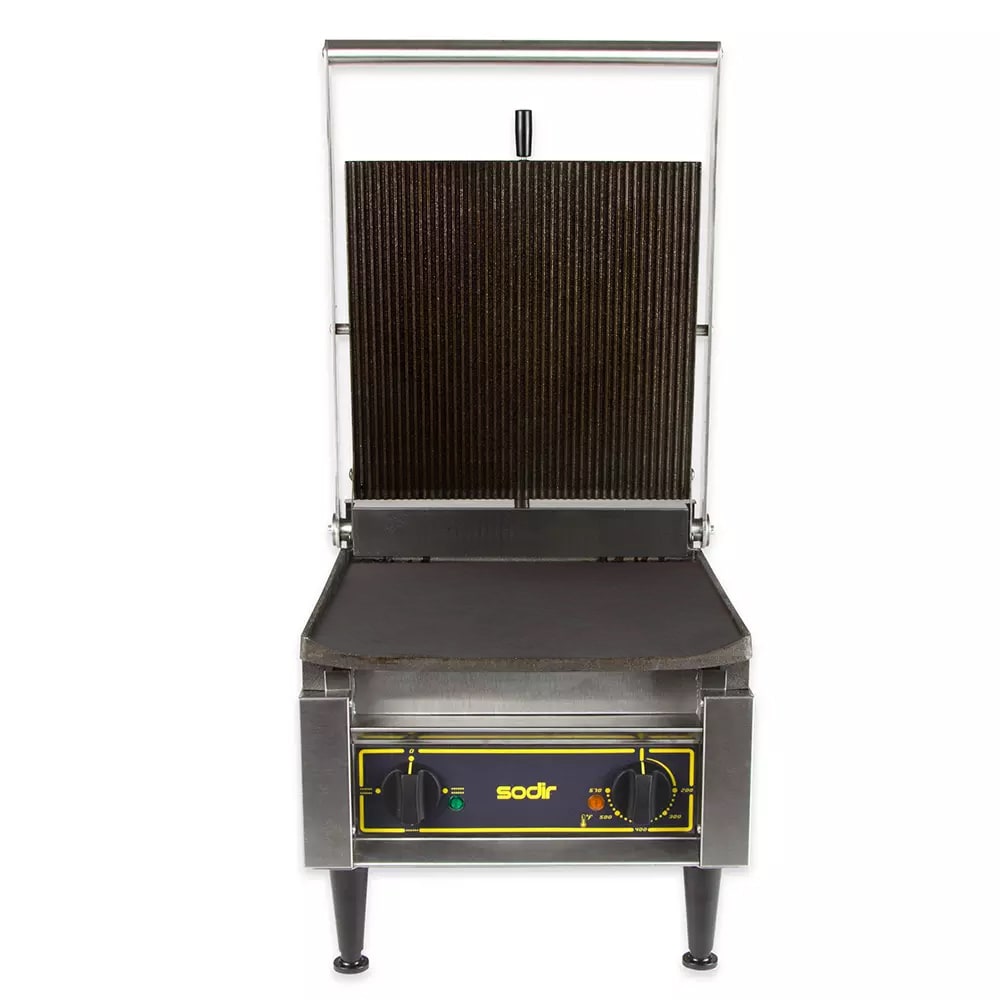Sodir-Roller Grill Panini Grill, cast iron grooved & smooth griddle plates, 14″W x 14″D grill area, adjustable spring counterbalanced top, front drip tray & scraper, grills with stainless steel construction, 570°F thermostatic controls for top & bottom, 208/240v/60/1-ph,13.0/15.0 amps, 3.6kW, NEMA 6-20P, cULus, cULus Classified