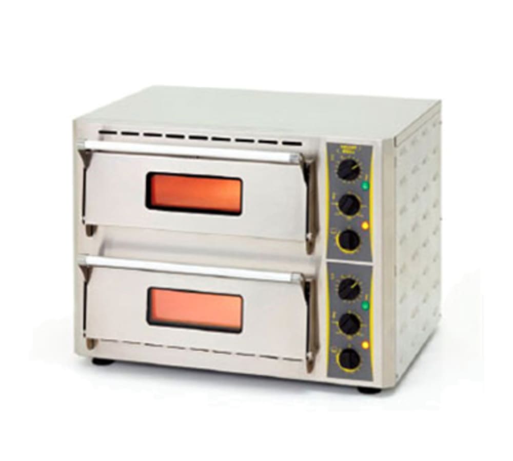 With two decks, the Equipex PZ-430D countertop pizza oven can simultaneously bake two 16-inch pizzas, and because the deck controls are separate, each product can be baked differently to accommodate thick or thin crust. The decks are constructed of brick that absorbs and radiates heat, cooking the pizza on all sides, while a thermostat underneath the deck regulates the bottom’s temperature and keeps it at the correct level, producing crispy crusts.