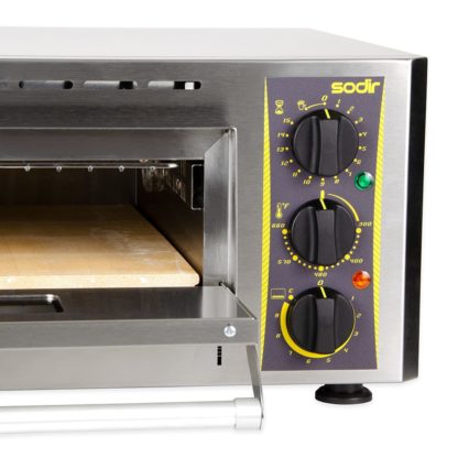 Sodir Pizza Oven, countertop, electric, fire brick stone, single deck, quartz heating elements, 660°F thermostatic controls, 15 min. timer with continuous cooking feature, second thermostat regulates heat under deck to perfectly bake thin and thick crusts, see-through glass door with interior light, stainless steel construction, 1- 16″ pizza, 120v/60/1-ph, 1.8 kW, 15.0 amps, NEMA 5-15P, ETL