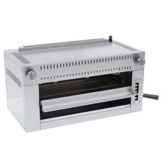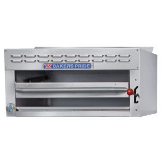 Staff can lower the top closer to the food on the rack to suit different foods and, when the rack is at its bottommost position, it can provide a temperature of 1,060 degrees Fahrenheit. This Equipex SEM-80VC-3 salamander is constructed of stainless steel for durability and its wire rack is removable to facilitate cleaning. A shallow layer of water can be poured into the pull-out tray, quenching drippings and keeping food from sticking.