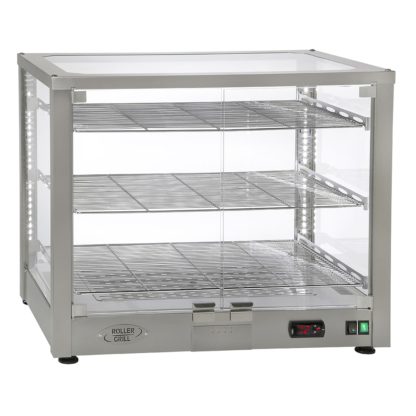Warming Display, 3-tier, accommodates (3) full size sheet pans (by others), fully panoramic, ventilated firestone heating system, 68 – 194° F, electronic thermostat, humidity control, LED interior lighting, 180 degrees hinged glass doors, fixed glass front & sides, stainless steel interior & exterior frame, 1.75 kW, 120v/60/1-ph