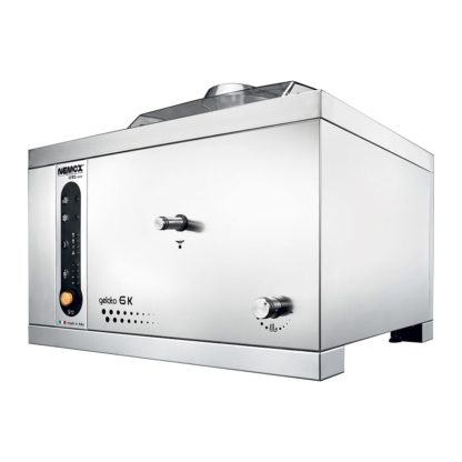 Nemox Gelato 6K Crea Machine, counter model, self contained, 12-15 minutes production time, makes 10.6 qt. (10L) per hour, electronic control system, 4 preset programs, magnetic lid, removable scrapers, drain, stainless steel construction, casters, 800 watts, 120v/60/1-ph, 6.6 amps, cord, NEMA 5-15P, NSF, cETLus