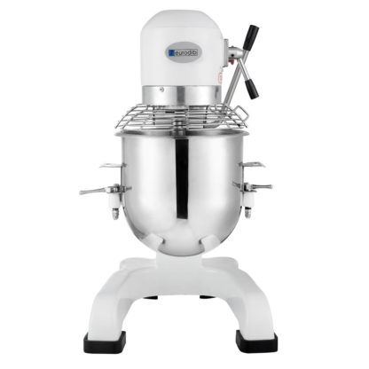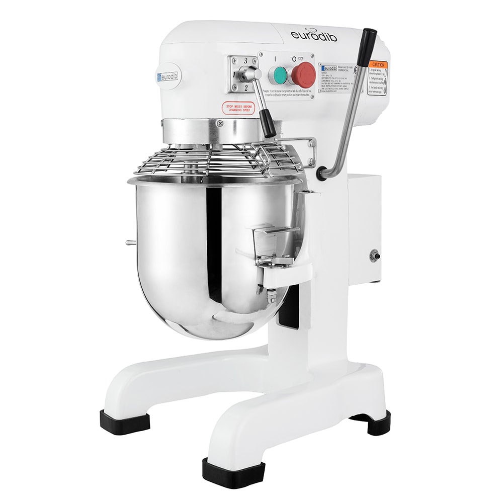 The Eurodib M10ETL bench model planetary mixer has a 10-quart capacity. Its planetary mixing action combines ingredients quickly and evenly, forming smooth mixtures and emulsions. The bowl, hook, whip, and beater are all made of stainless steel for durability. Its gear-driven transmission is designed to withstand heavy use and mixes at three speeds-low, medium, and high-though it isn’t recommended for mixing heavy doughs.