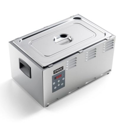 Designed to reheat cooked food to safe serving temperatures, the Eurodib SR11 sous vide cooker uses a water bath and circulation to heat accurately. It has adjustable temperature controls and users can monitor the level on the LED display, which shows in Fahrenheit or Celsius. The control system has room to store five recipes. This unit comes with a lid that holds heat inside to maintain temperature level and prevent water evaporation. Handles are built into the sides, so carrying is comfortable.
