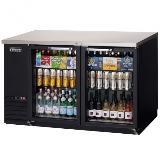 The EBB59G-24 is a 57-3/4″ wide, 24-1/2″ deep, two-section insulated glass door back bar cooler refrigerator from Everest Refrigeration. This unit is equipped with a stainless steel countertop as well as a textured and laminated black vinyl exterior. This glass door back bar cooler refrigerator has the capacity for up to (560) 12 oz. cans or (357) 12 oz. bottles in 17 cubic feet of space.