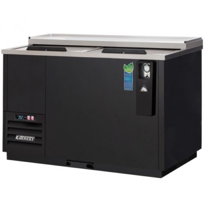 The EBC50 is a 49-1/2″ wide, insulated horizontal bottle cooler from Everest Refrigeration. This unit is equipped with a stainless steel countertop, rail and 2 lids with a textured and laminated black vinyl exterior. There are 3 bin dividers and 2 floor shelves on this bottle cooler. The EBC50 has the capacity for (576) 12 oz. cans or (396) 12 oz. bottles in 15 cubic feet of space.
