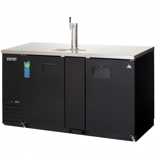 The EBD3-BB is a 68″ wide, two-section insulated back bar and direct draw keg refrigerator combo from Everest Refrigeration. This unit is equipped with a stainless steel countertop as well as a textured and laminated black vinyl exterior. There is 1 NSF approved 3″ diameter insulated stainless steel draft arm with an air distributor and the capacity for (1) 1/2 and (1) 1/4-slim barrel and up to (360) 12 oz. cans or (240) 12 oz. bottles in 24 cubic feet of space.