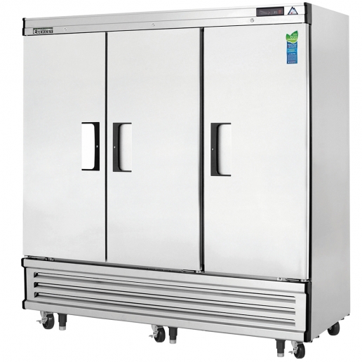The EBF3 is a 74-3/4″ wide, three-section stainless steel insulated reach-in freezer from Everest Refrigeration with 3 self-closing and field reversible doors and shatterproof LED interior lighting. This freezer has a stainless steel interior and exterior, a digital control system, 9 shelves and 70 cubic feet of space.