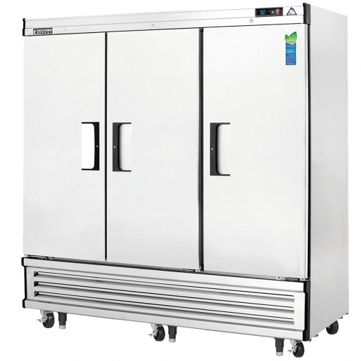 The EBR3 is a 74-3/4″ wide, three-section stainless steel insulated upright reach-in refrigerator from Everest Refrigeration with 3 full-size self-closing and field reversible doors and shatterproof LED interior lighting. This refrigerator has a stainless steel interior and exterior, a digital control system, 9 shelves and 71 cubic feet of space.