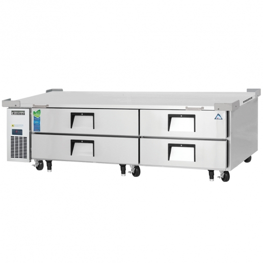 The ECB82D4 is a 82-3/8″ wide, stainless steel insulated two-section chef base refrigerator from Everest Refrigeration. This unit is equipped with a stainless steel interior and exterior with a galvanized steel finished bottom and back exterior wall. There are 4 insulated drawers on this chef base refrigerator that have the capacity for (10) full size pans.