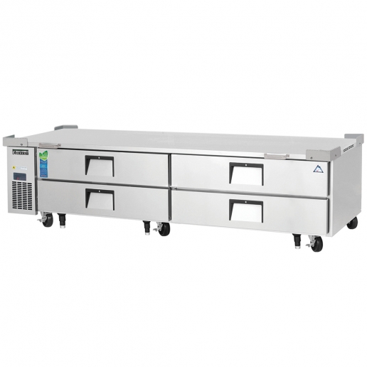 The ECB96D4 is a 95-1/2″ wide, stainless steel insulated two-section chef base refrigerator from Everest Refrigeration. This unit is equipped with a stainless steel interior and exterior with a galvanized steel finished bottom and back exterior wall. There are 4 insulated drawers on this chef base refrigerator with the capacity for (10) full size pans.