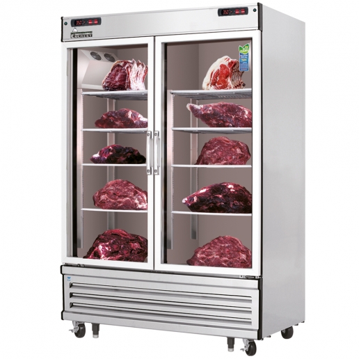 The EDA2 is a two section glass door dry aging / thawing refrigerator from Everest Refrigeration. This unit is equipped with a heavy duty stainless steel exterior as well as PFOA free ceramic coated aluminum interior walls which enhance the meat maturation process. Two swing doors with double glass panes ensures proper insulation on this unit and shielded LED interior lighting provides excellent visibility within the EDA2. With 50 cubic feet of space and 8 stainless steel shelves, this unit offers plentiful space for your meats.
