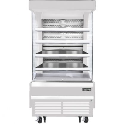 There are four adjustable shelves, LED bar lighting in the canopy and under shelves, and a retractable night curtain on this insulated vertical open air refrigerated merchandiser. The EOMV-36-W-28-T maintains a 35 degrees F operating temperature. This merchandiser features a white moisture-resistant exterior and stainless steel interior with floor drains.