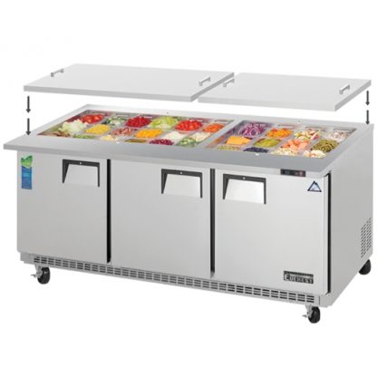 The EOTP3 is a 71-1/8″ wide open top prep table from Everest Refrigeration with 3 adjustable self-closing doors. This open top prep table has a stainless steel interior and exterior with 19 cubic feet of space and (30) 1/6 sized pans.