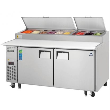 The EPPR2 is a 71″ wide, stainless steel insulated pizza prep table from Everest Refrigeration. This unit is equipped with a side mounted condensing unit, (2) 1/2″ thick insulated top lids and a 19-1/4″ deep slide-out cutting board. This pizza prep table has a stainless steel interior and exterior and a digital control system. The EPPR2 is built to accommodate (9) 1/3 size top rail pans and has 23 cubic feet of space.