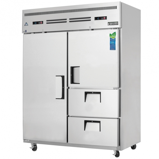 The ESWQ2D2 is a 59″ wide, two-section stainless steel insulated door and drawer combination dual temperature refrigerator/freezer combo from Everest Refrigeration. This unit is equipped with 1 full-size and 1 half-size self-closing door with 2 drawers and shatterproof LED interior lighting. This refrigerator/freezer combo has a stainless steel interior and exterior, a digital control system, 39 cubic feet of space in the refrigerator section and 13 cubic feet of space in the freezer section.