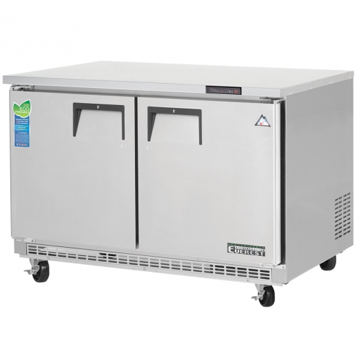The ETBF2 is a 47-1/2″ wide, stainless steel insulated two-section back mount undercounter worktop freezer from Everest Refrigeration with 2 adjustable self-closing doors. This freezer has a stainless steel interior and exterior, a multi-functional digital controller with an easy to read LED display, and 14 cubic feet of space.