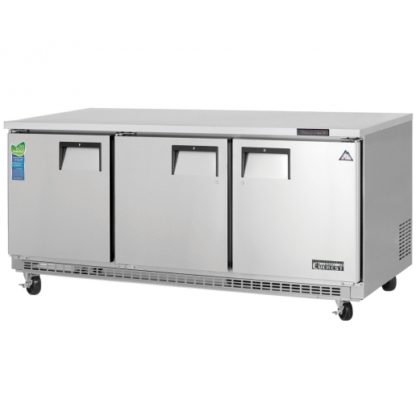 The ETBF3 is a 71-1/8″ wide, stainless steel insulated three-section back mount undercounter worktop freezer from Everest Refrigeration with 3 adjustable self-closing doors. This freezer has a stainless steel interior and exterior, a multi-functional digital controller with an easy to read LED display, and 22 cubic feet of space.