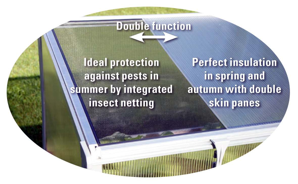 Imported from Austria, the cold frame features two covers, including a unique insect netting to protect your plants and allow use in warmer times. You can easily water your plants right through the netting. The panels are extremely durable and are made of 4mm twin-wall polycarbonate, providing a high level of insulation.