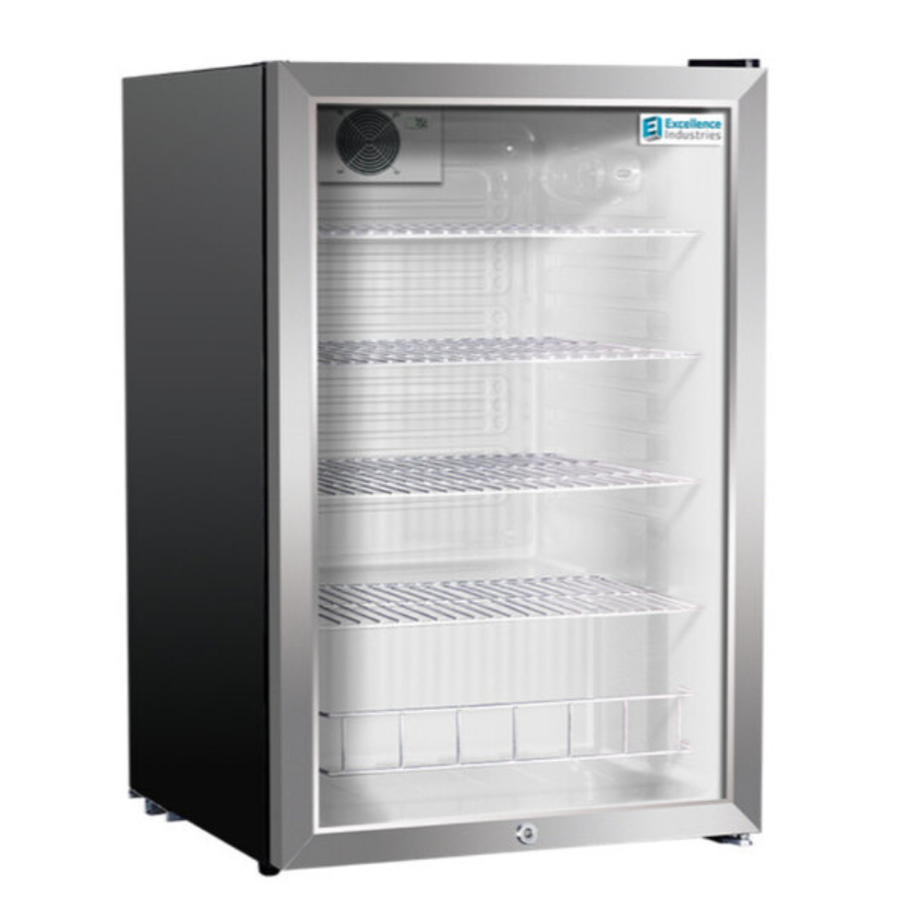 Boost impulse sales with this Excellence EMM-5HC black countertop display refrigerator with stainless steel swing door! Designed with one glass door, this refrigerator is ideal for self-service applications. Its fully insulated, self-closing design helps to keep cold air in without reducing the visibility of your products, while the standard lock helps prevent theft. Four shelves allow for multi-layered storage of your most popular items.